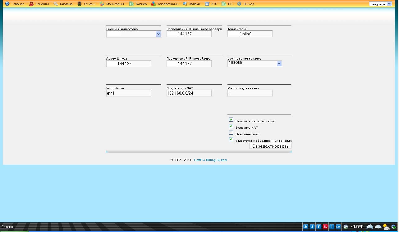 1. после настройки траффпро и заведения всех клиентов в локальной сети все работает нормально, но доступность форума и веб-клиента почты (squirrelmail) которые наздятся на том же сервере что и траффпро происходит с задержкой (секунд ~15-20) так же с сети интернет практически невозможно подключиться на сервер по ssh и происходят ошибки при доступе на вышеуказанные сайты. Напирмер, в 3 из 5 случаях соединение по ssh отваливается по таймауту. Ниже приведены настройки системы со скриншотамиTraffPRO: Enterprise v1.4.0-01 + ATSLogerPHP: 5.3.5-0.dotdeb.1web-сервера: Apache/2.2.16 (Debian)mySQL: 5.1.45-3настройки шлюза первого провайдеранастройки шлюза второго провайдерасписок шлюзовнастройка внешнего интерфейса первого провайдеранастройка внешнего интерфейса второго провайдерасписок внешних интерфейсовзаведение сервера в качестве клиента по локальному ip-адресуфайл конфигурации traffpro.cfg# cat /etc/traffpro/traffpro.cfgto_install_dir=/opt/traffprodaemon=truedb_url=localhostdb_usr=rootdb_passwd=***db_name=traffprotime_in=15time_out=720control_eth_addr=truenet_number=0ports_detail=truess_enabled=trueeth_out=eth1url_detail=trueout_ip=x.x.144.138listen_addr=127.0.0.1listen_port=9999ip_queue_maxlen=2048000url_block=truenot_udptcp_control=trueantiflood=500log_route=truenat_data_in_db=trueurl_no_port=falseredirect_server_auth_on=trueip_to_redirect_auth=192.168.0.2port_to_redirect_auth=81port_to_redirect_access_denied=82проверка работоспособности локального кэширующего днс-сервера# dig @127.0.0.1 mail.ru; <<>> DiG 9.6-ESV-R1 <<>> @127.0.0.1 mail.ru; (1 server found);; global options: +cmd;; Got answer:;; ->>HEADER<<- opcode: QUERY, status: NOERROR, id: 57782;; flags: qr rd ra; QUERY: 1, ANSWER: 4, AUTHORITY: 6, ADDITIONAL: 5;; QUESTION SECTION:;mail.ru. IN A;; ANSWER SECTION:mail.ru. 49 IN A 94.100.191.202mail.ru. 49 IN A 94.100.191.203mail.ru. 49 IN A 94.100.191.204mail.ru. 49 IN A 94.100.191.201;; AUTHORITY SECTION:mail.ru. 66 IN NS ns3.mail.ru.mail.ru. 66 IN NS ns2.mail.ru.mail.ru. 66 IN NS ns5.mail.ru.mail.ru. 66 IN NS ns1.mail.ru.mail.ru. 66 IN NS ns4.mail.ru.mail.ru. 66 IN NS ns.mail.ru.;; ADDITIONAL SECTION:ns1.mail.ru. 244 IN A 94.100.179.159ns2.mail.ru. 461 IN A 94.100.186.189ns3.mail.ru. 533 IN A 94.100.178.66ns4.mail.ru. 172 IN A 94.100.178.64ns5.mail.ru. 350 IN A 94.100.178.54;; Query time: 1 msec;; SERVER: 127.0.0.1#53(127.0.0.1);; WHEN: Thu Mar 24 15:59:43 2011;; MSG SIZE rcvd: 276пинг со шлюза в сеть интернет# ping mail.ruPING mail.ru (94.100.191.204) 56(84) bytes of data.64 bytes from 94.100.191.204: icmp_seq=1 ttl=47 time=42.2 ms64 bytes from 94.100.191.204: icmp_seq=2 ttl=47 time=42.3 ms64 bytes from 94.100.191.204: icmp_seq=3 ttl=47 time=42.0 ms^C--- mail.ru ping statistics ---3 packets transmitted, 3 received, 0% packet loss, time 2007msrtt min/avg/max/mdev = 42.074/42.196/42.310/0.096 msПодскажите из-за чего может быть отсутствие доступа с внешней сети (интернет)?2. Второй вопрос заключается в том Как можно отключить проверку работоспособности системой траффпро одного из каналов (проще говоря как сделать так чтобы один из шлюзов всегда был в работе даже если не подключен кабель)? При смене айпи-адреса на адрес сетевой карты шлюза шлюз отваливается (видно в главная - информация о системе - информация о шлюзах) если поменять айпи адрес для проверки на адрес первого из из маршрутизаторов который стоит за шлюзом то связь сразу же появляется. Можт возможно снести какую-либо службу в системе которая отвечает за проверку работоспособности сетевых интерфейсов (желательно полное название службы/пакета).p.s. если понадобятся какие-либо скрины/файлы то только скажите
